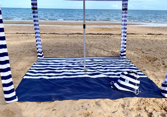 2.5m x 2.5m Navy Striped Beach Mat with Hole + Beach Bag