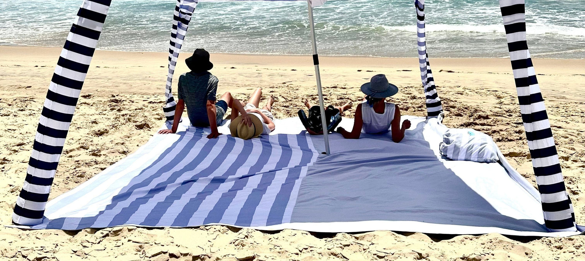 Shop our popular Cool Grey Beach Mat featuring a striped & block coloured top side and white underside designed to compliment cabanas or umbrellas.