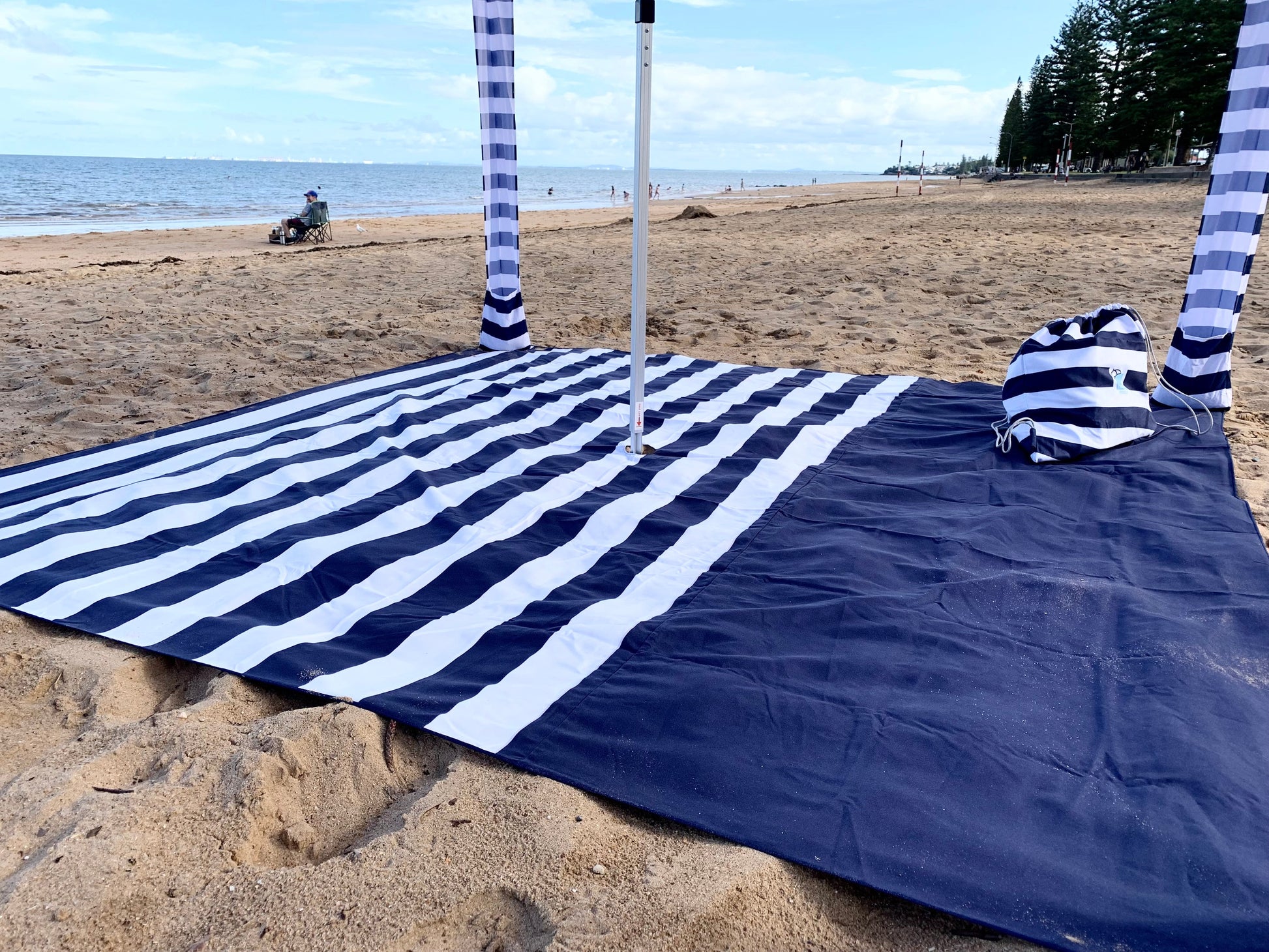 2.5m x 2.5m Navy Striped Beach Mat with Hole + Beach Bag